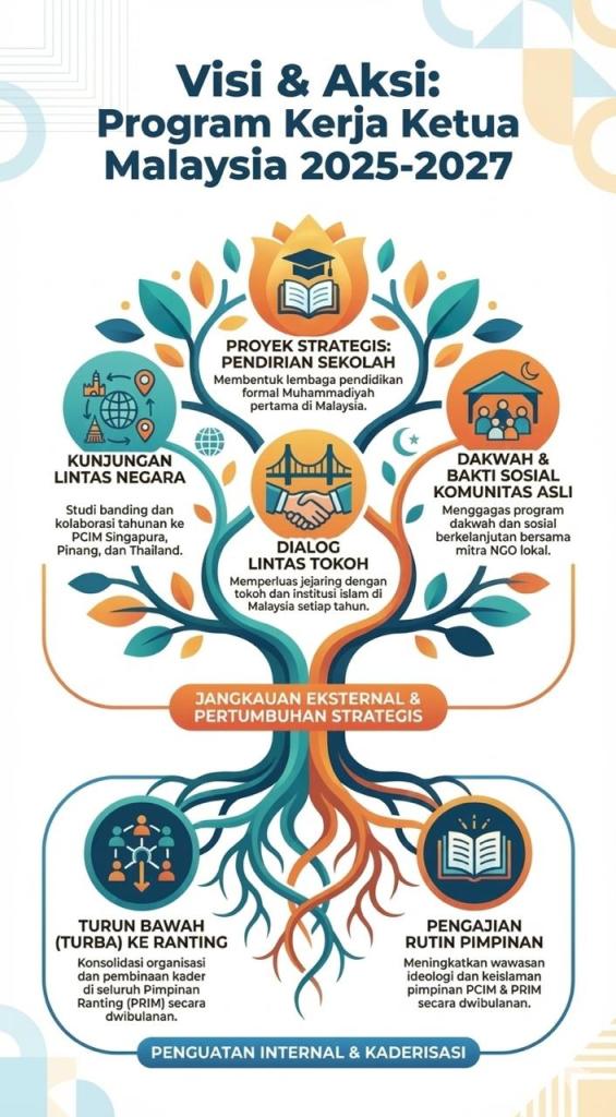 | – Proyek strategisnya adalah pendirian sekolah: merintis dan membentuk lembaga pendidikan formal pertama Muhammadiyah di Malaysia. – Menjadi tonggak pendidikan yang menggabungkan nilai-nilai Islam dan kemajuan ilmu pengetahuan. – Kunjungan lintas negara: melaksanakan studi banding dan kolaborasi tahunan dengan PCIM di negara jiran seperti Singapura, Pulau Pinang, dan Thailand. – Memperluas jaringan persaudaraan dan berbagi pengalaman antar cabang luar negeri. – Dialog lintas tokoh: mengadakan pertemuan dan dialog strategis dengan tokoh-tokoh agama, intelektual, dan institusi Islam di Malaysia setiap tahun. – Membangun citra positif dan memperluas kerja sama dakwah. – Dakwah dan bakti sosial masyarakat Orang Asli: menggagas dan melaksanakan program dakwah serta kegiatan sosial yang berkelanjutan bersama mitra NGO lokal. – Memberikan manfaat nyata tidak hanya kepada warga Indonesia, tetapi juga masyarakat setempat. |